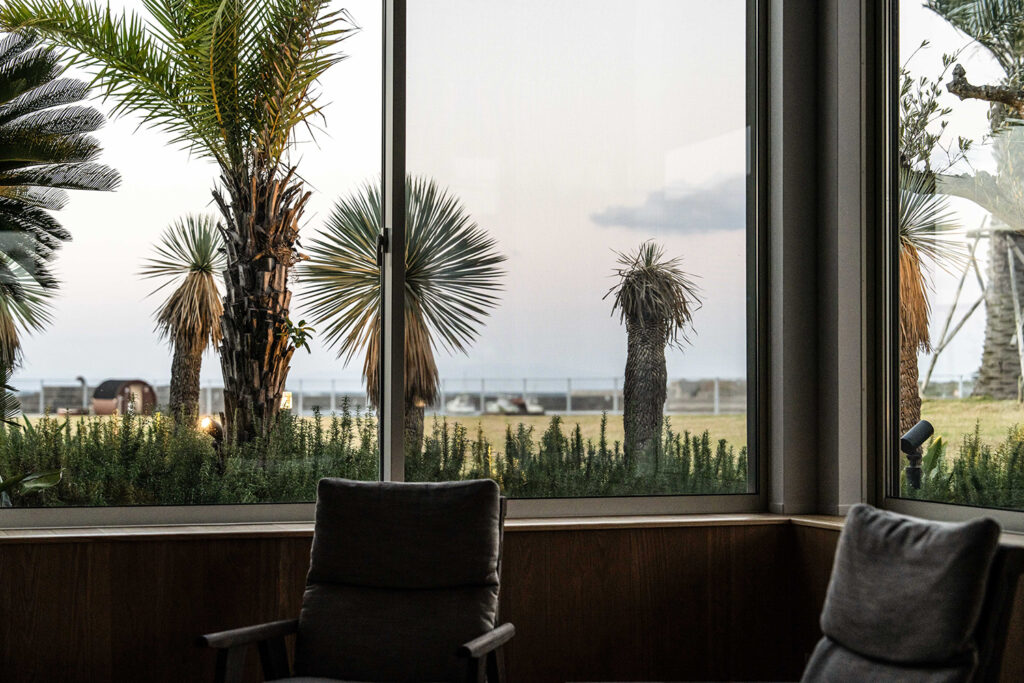 WOOVの居心地の良い空間を創り上げる植栽は、プラントハンター・西畠清順氏によるもの。“ひとの心に植物を植える”活動・そら植物園の代表を務め、世界中を旅してさまざまな植物を収集し、国内外の多様なプロジェクトで植栽をプランニングしています。WOOVの植栽では、海辺の景色とマッチする木々を厳選。象徴的なヤシや推定樹齢100年のオリーブをはじめ、すべてを常緑樹で統一することで、年間を通じて美しいフォルムの緑が絶えない庭を創り上げました。海と緑が織りなす空間は、WOOVでしか味わえないグラマラスな滞在体験の重要なエッセンスになっています。